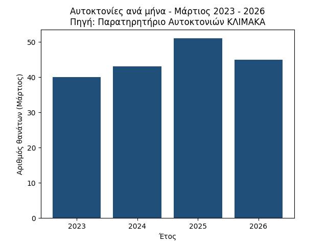 Το Παρατηρητήριο Αυτοκτονιών του Κέντρου για την Πρόληψη της Αυτοκτονίας της ΚΛΙΜΑΚΑ παρουσιάζει τα στοιχεία που αφορούν τις τάσεις των αυτοκτονιών για τον μήνα Μάρτιο 2026. Σύμφωνα με τη νεότερη ανάλυση του ερευνητικού δικτύου καταγραφής, καταγράφηκαν τουλάχιστον 45 θάνατοι στην ελληνική επικράτεια. Η συνολική εικόνα του μήνα αποτυπώνει ένα ζήτημα που όχι μόνο δεν υποχωρεί, αλλά παγιώνεται σε ανησυχητικά υψηλά επίπεδα.