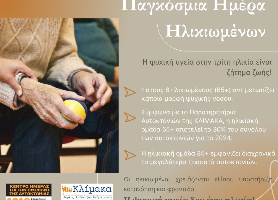 Η φροντίδα των ηλικιωμένων δεν είναι μόνο ζήτημα υγείας, αλλά και βαθιάς ηθικής και κοινωνικής ευθύνης. Στο Κέντρο Ημέρας για την Πρόληψη της Αυτοκτονίας της ΚΛΙΜΑΚΑ, εργαζόμαστε καθημερινά με επιστημονικότητα και ευαισθησία ώστε κανείς ηλικιωμένος να μην αισθάνεται μόνος, αόρατος ή χωρίς ελπίδα.