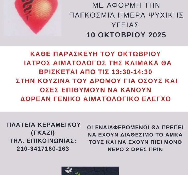 Κάθε Παρασκευή του Οκτωβρίου, 13:30 – 14:30, αιματολόγος της ΚΛΙΜΑΚΑ θα βρίσκεται στην Κουζίνα του Δρόμου (Πλατεία Κεραμεικού – Γκάζι) για δωρεάν γενικό αιματολογικό έλεγχο σε όσους/όσες το επιθυμούν.