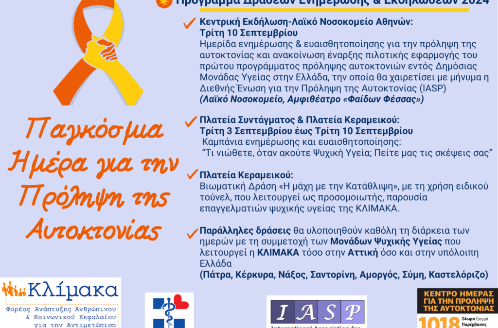 Με την Παγκόσμια Ημέρα για την Πρόληψη της Αυτοκτονίας, στις 10 Σεπτεμβρίου να πλησιάζει, αυξάνονται σταδιακά οι δράσεις ενημέρωσης και ευαισθητοποίησης που υλοποιεί η ΚΛΙΜΑΚΑ σε όλη τη χώρα.